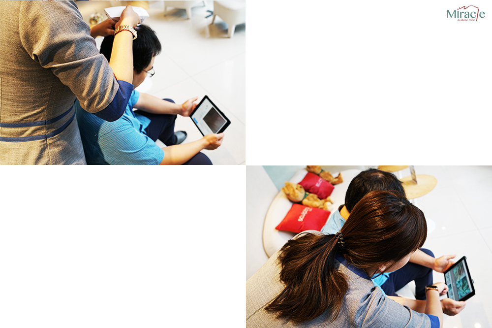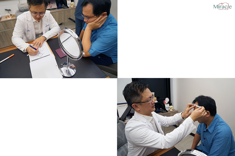 黃院長在幫主任諮詢,兩位醫師的對話真是太深奧~另外補充一個小知識,人臉比例是上下臉個三分之一比例是最好看的,由此為基準去評估客戶髮際線需要往前推的程度。