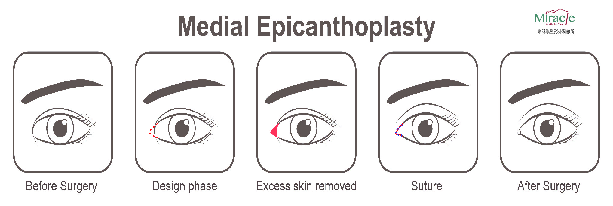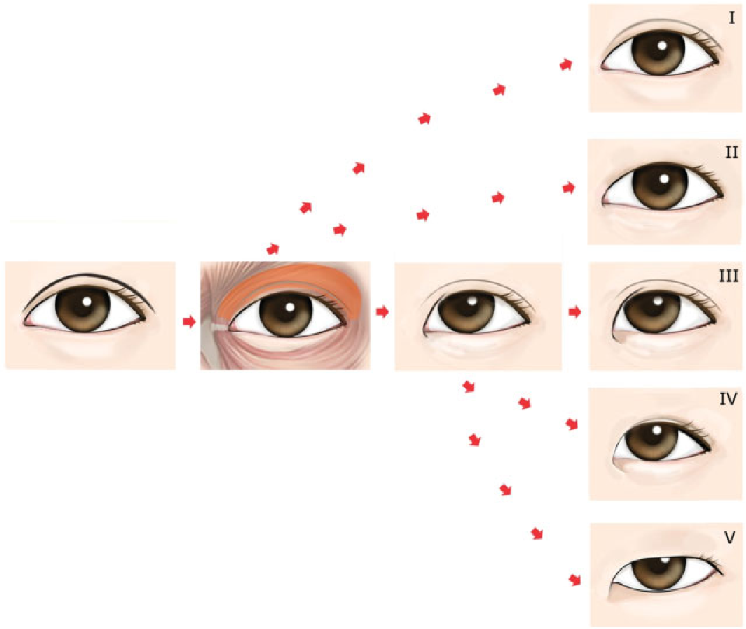 又稱為隱痕眼頭手術,藉由去掉覆蓋眼頭的內贄皮,將附近的皮膚做沾黏處的剝離,然後重新貼合,疤痕就會沿著眼頭的位置,未來則比較不明顯。