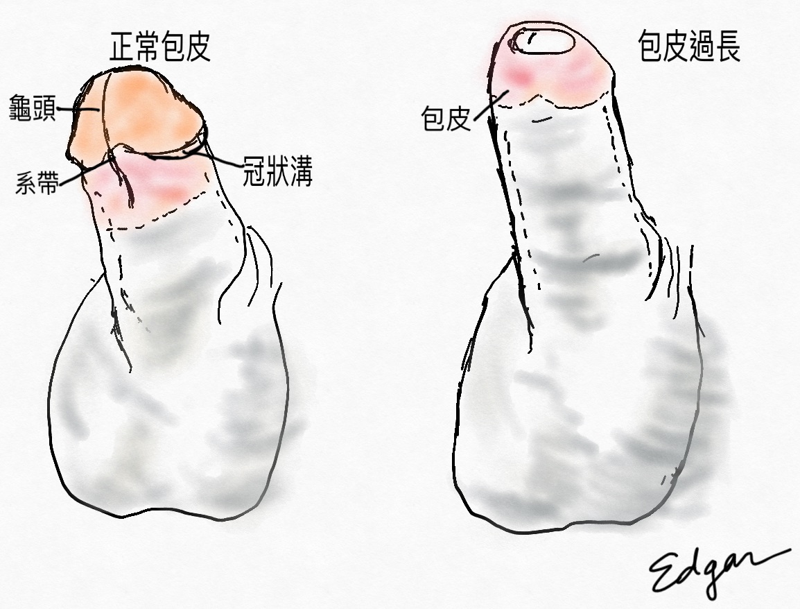 正常生殖器在沒有勃起的狀態,包皮可以退到龜頭。自慰時把包皮往下褪,只露出龜頭一小部份尿道口代表包皮比較長,進一步想要把包皮往下推露出整個龜頭會很痛,代表這不僅是單純包皮過長,而且還有包皮過緊的問題,未來有和女性有親密性交,陰莖進入陰道的時候因為包皮太緊了引起疼痛而消軟,無法行房。 又或者包皮往下推,會有一圈在龜頭下面,比較緊,要多注意。尤其在性行為時,陰莖勃起包皮卡在冠狀溝,容易引起男生在性交時陰莖疼痛,因而抑制性興奮和快感,陰莖疲軟失去性趣。這兩種狀況可考慮割包皮。 包皮切除手術:青少年、成年人採局部麻醉,門診手術即可。 割包皮會痛嗎?手術利用微創技術,將陰莖多餘的皮膚移除。術後第1天可能因腫脹、排尿碰觸疼痛,大約一週後消腫。 另一種治療方式是新一代一次性包皮環切吻合器(俗稱包皮槍),10分鐘手術完成約一週內,有著出血少, 恢復期快的特性。