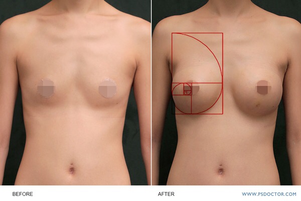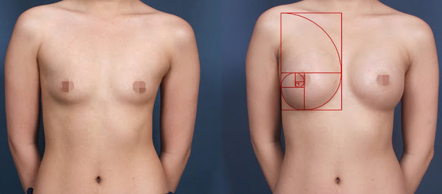如同下面兩個例子所顯示,可以看到如同上圖的鸚鵡螺,從乳頭位置一路到乳房下緣,然後到鎖骨側,表現出來的是符合黃金比例之美。